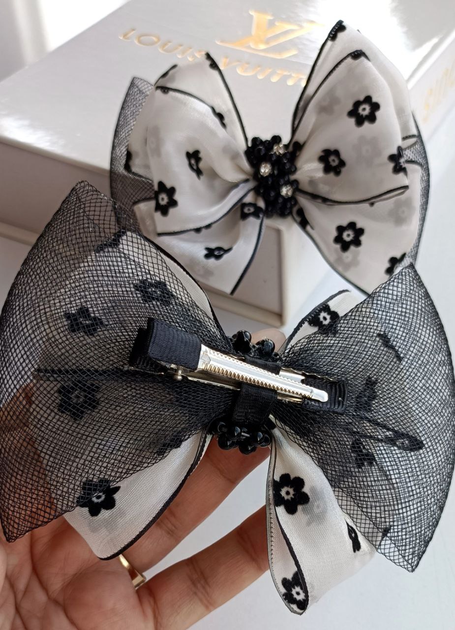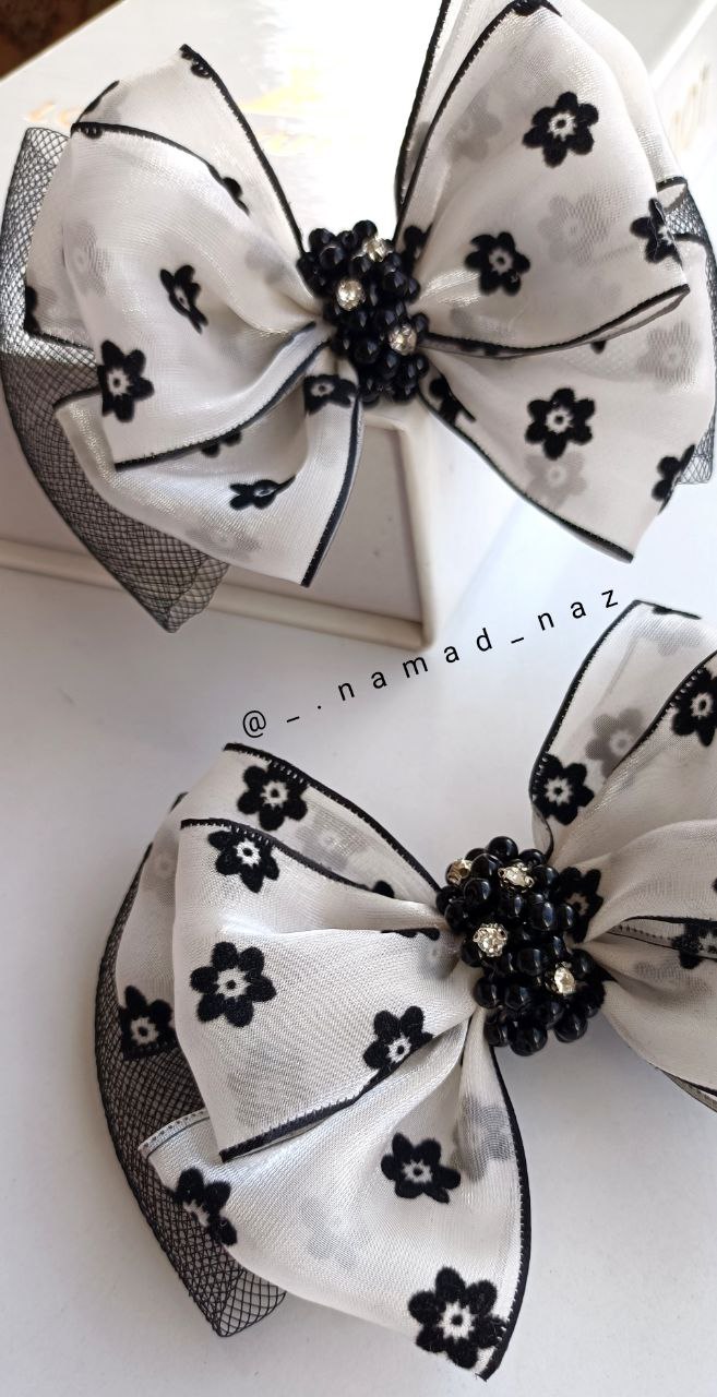 گیره پاپیونی حریر گل گلی با مرکز جواهردوزی مشکی